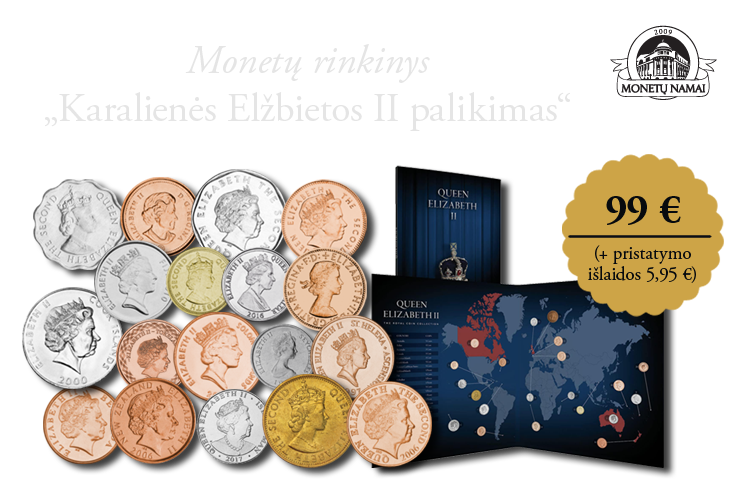 KOMPLEKTACIJA. Monetų rinkinys „Karalienės Elžbietos II palikimas“ pristatomas specialiame dėkle su pasaulio žemėlapiu.